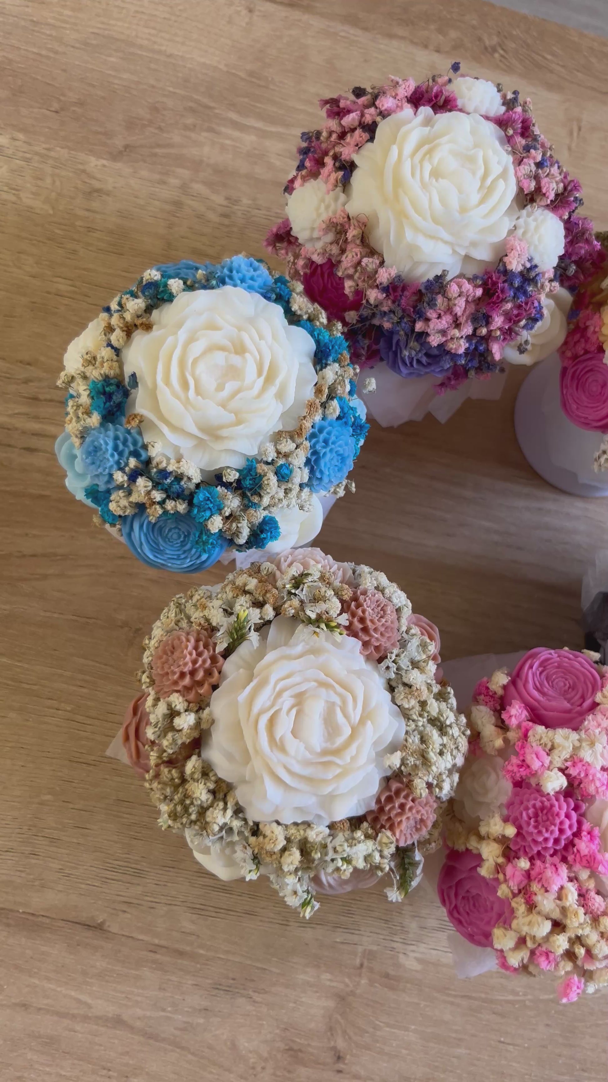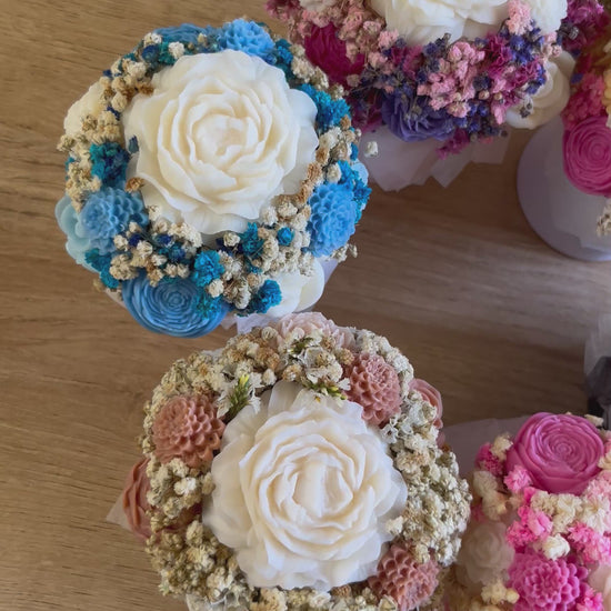 Composé de fleurs en cire de colza soigneusement moulées et délicatement parfumées.